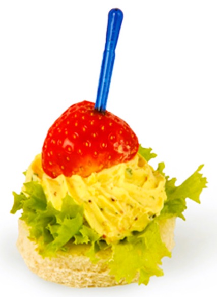 Elegant canapés with honey mustard cream cheese, ideal for corporate catering, business meetings, conferences, and office events in London. A soft base of white bread is topped with smooth cream cheese blended with sweet honey and mild mustard, creating a perfectly balanced sweet-and-savory flavour. Finished with fresh lettuce and a light fruit garnish, these canapés are served cold and beautifully presented, making them a refined vegetarian option for modern event menus.