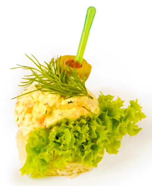 White wheat bread, crayfish terrine (freshwater crayfish), horseradish, fresh lettuce, dill, seasoning.