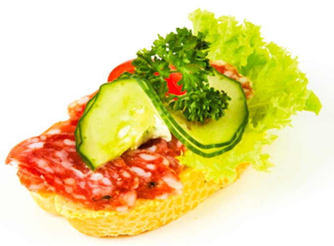 White wheat bread (Diplomat cut), French mountain salami, fresh lettuce, cucumber, tomato, parsley.